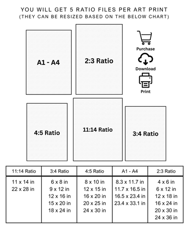 For each art print you will receive 5 high-resolution PNG files. These files are set up in different aspect ratios to ensure you can print dozens of common sizes. An instruction sheet will come with each purchase with a size chart.